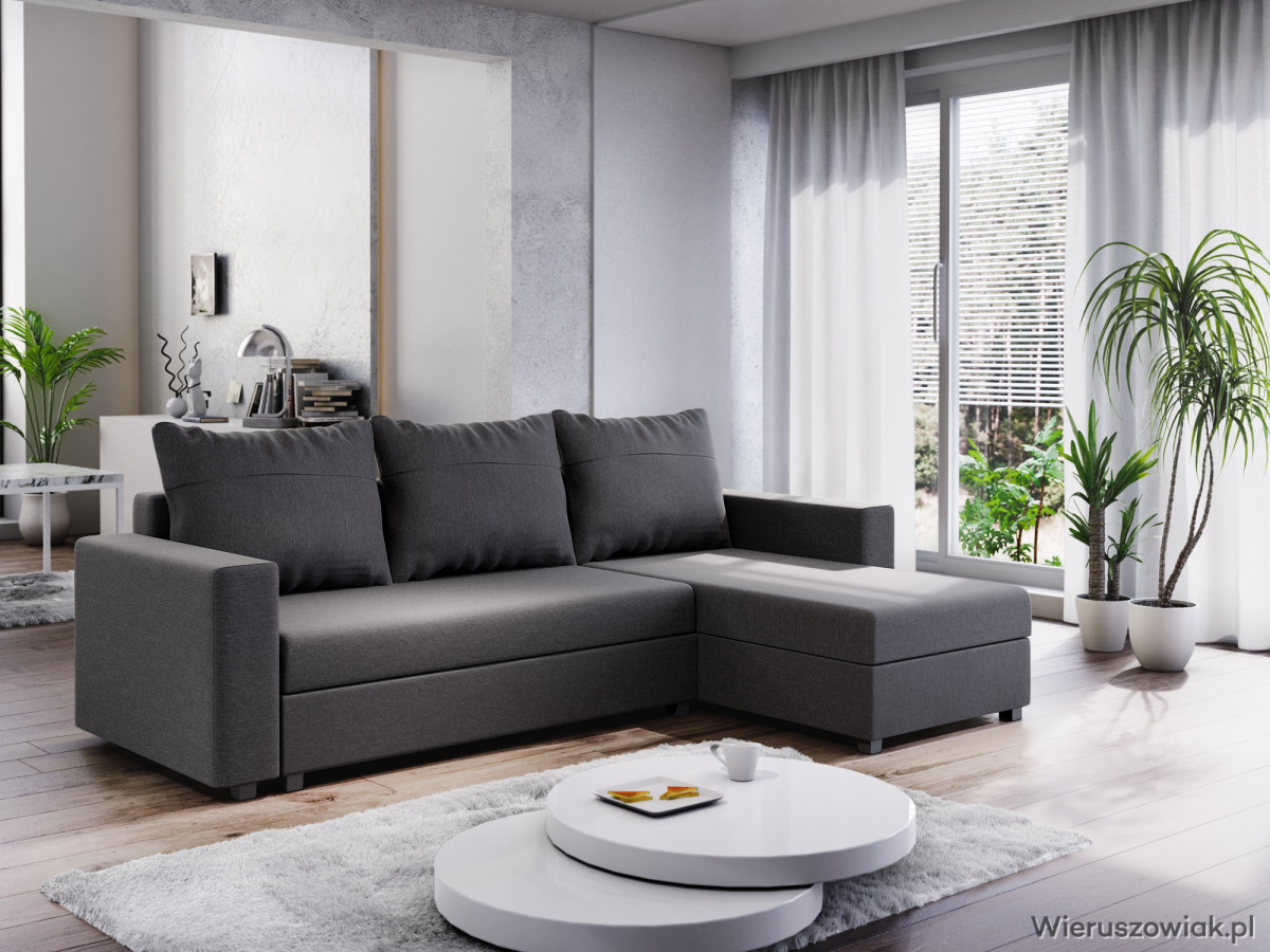 Dzięki funkcji spania, narożnik świetnie sprawdzi się jako dodatkowe miejsce noclegowe dla gości. Wbudowany pojemnik na pościel umożliwia praktyczne przechowywanie, pomagając utrzymać porządek w pomieszczeniu.