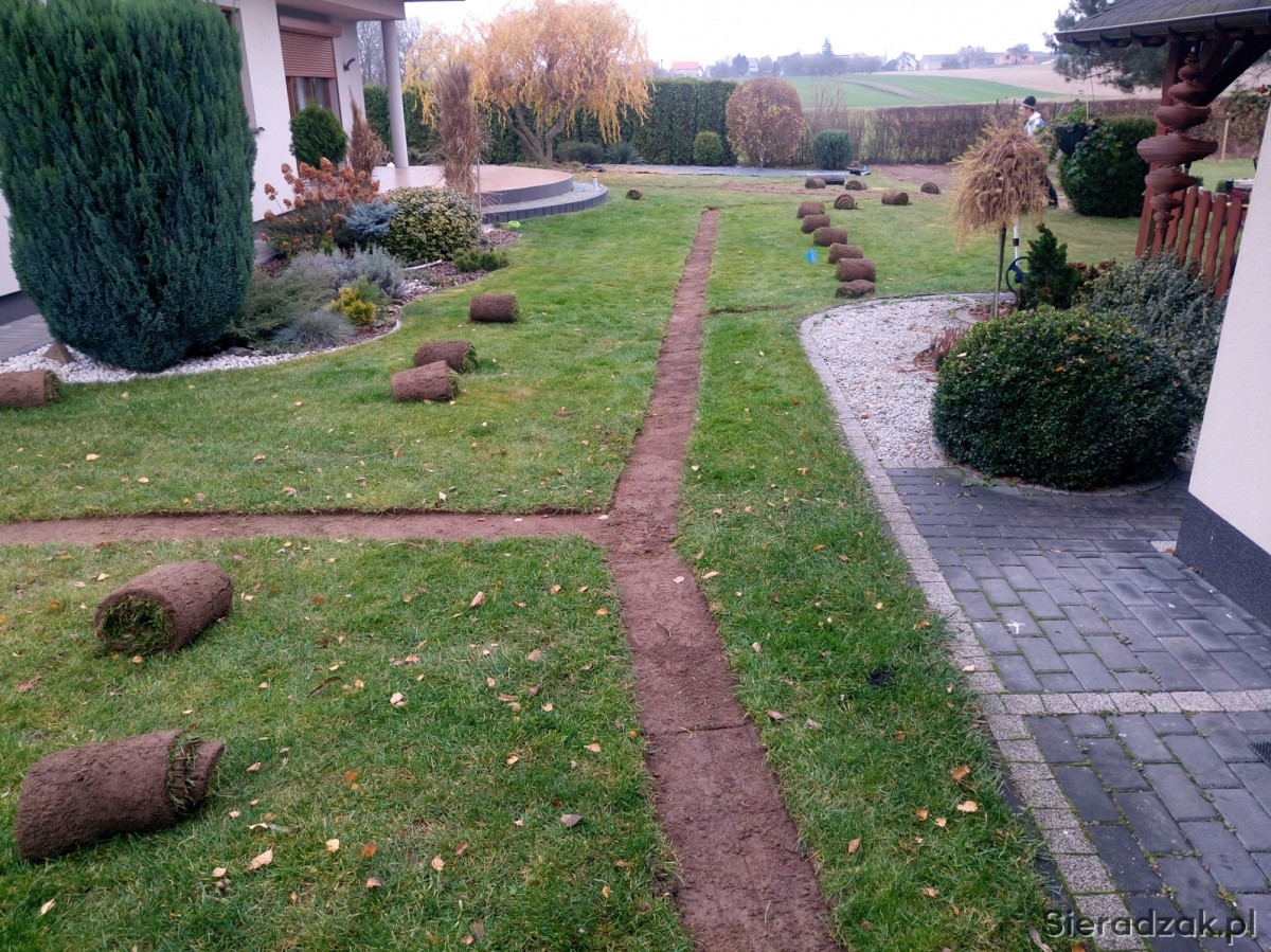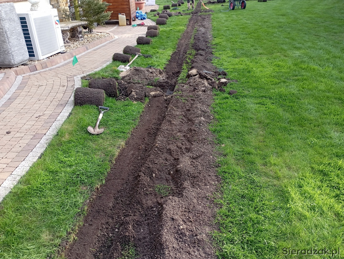 - nawodnienia zakładamy na nowych ogrodach oraz na istniejących założeniach. Ściągamy trawnik wykrawarką do darni, a instalację układamy w wąskich wykopach zrobionych koparką łańcuchową. Po 2-3 tygodniach nie ma śladu ingerencji w trawnik.