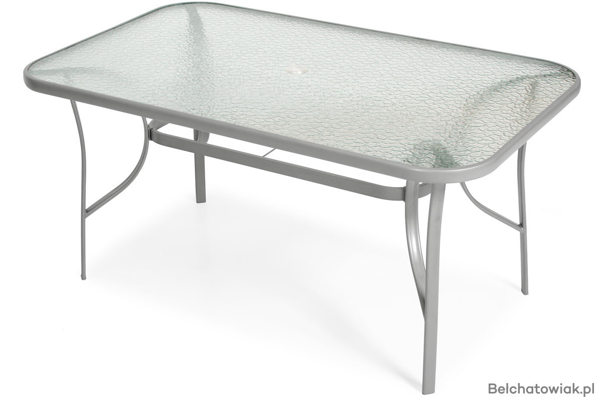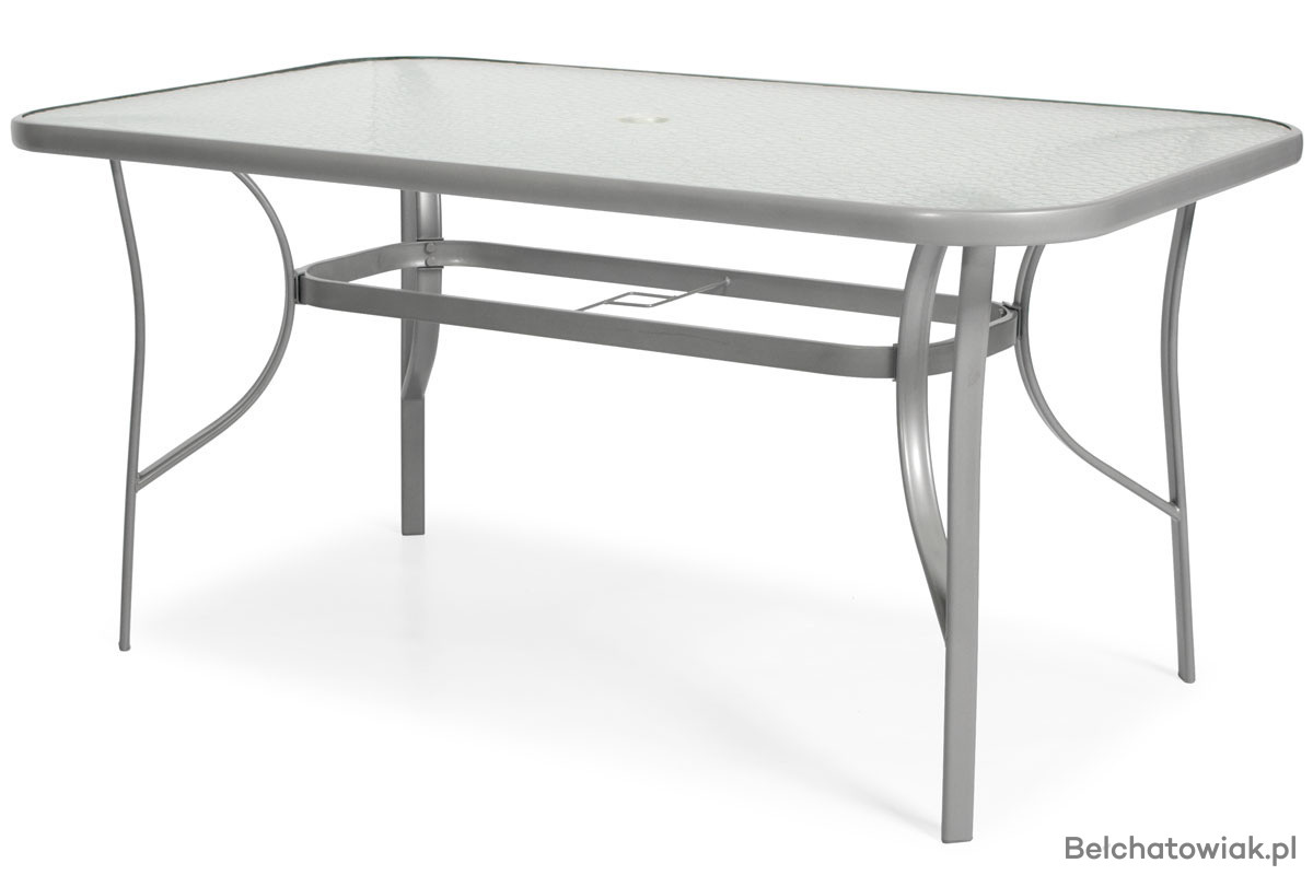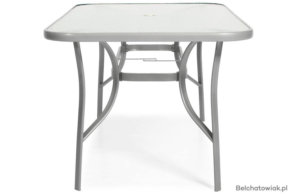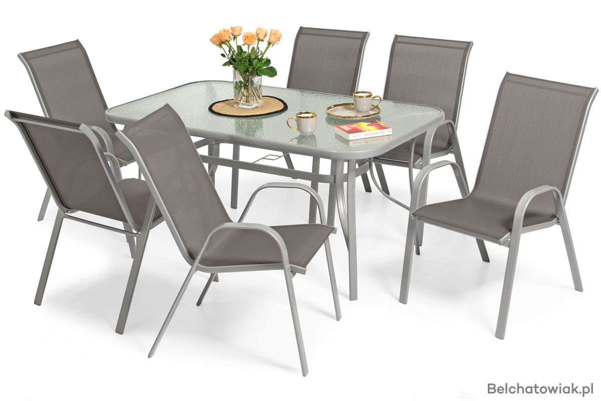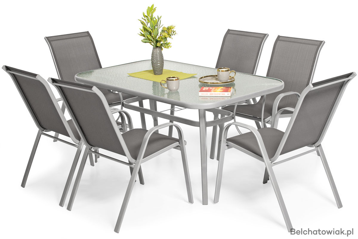 Zestaw mebli ogrodowych PORTO 6-osobowy: 6 krzeseł i stół ogrodowy z otworem na parasol. Eleganckie meble zewnętrzne idealne na taras, balkon i do ogrodu. Stabilna metalowa konstrukcja, blat stołu z hartowanego szkła i siedziska z wodoodpornego textilenu.